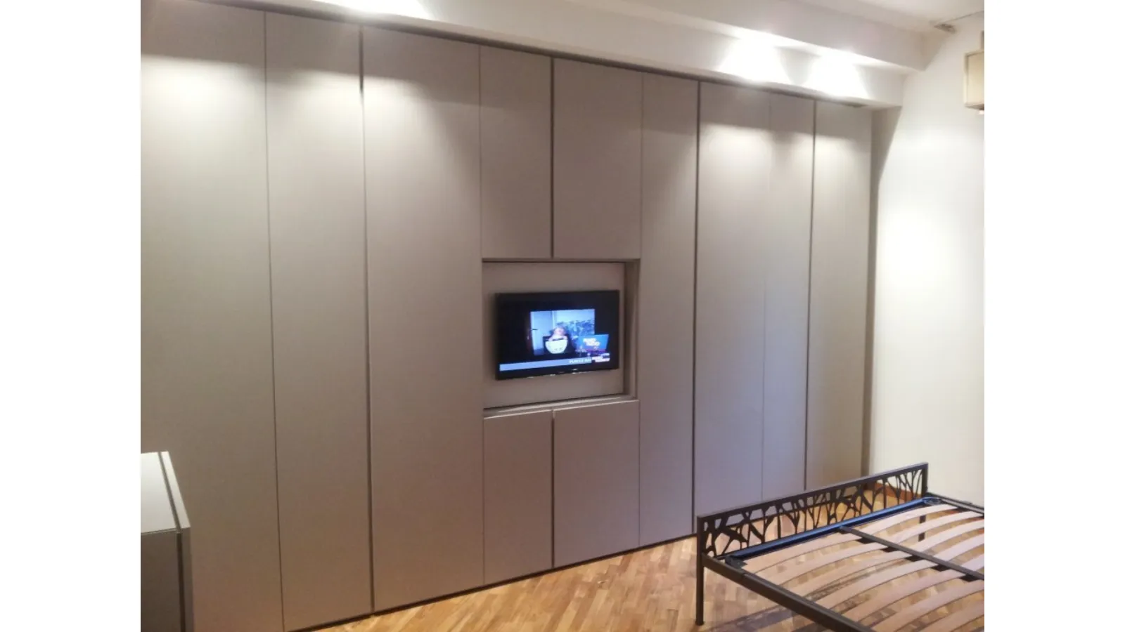 Armadio grigio moderno con ante battenti e spazio tv integrato