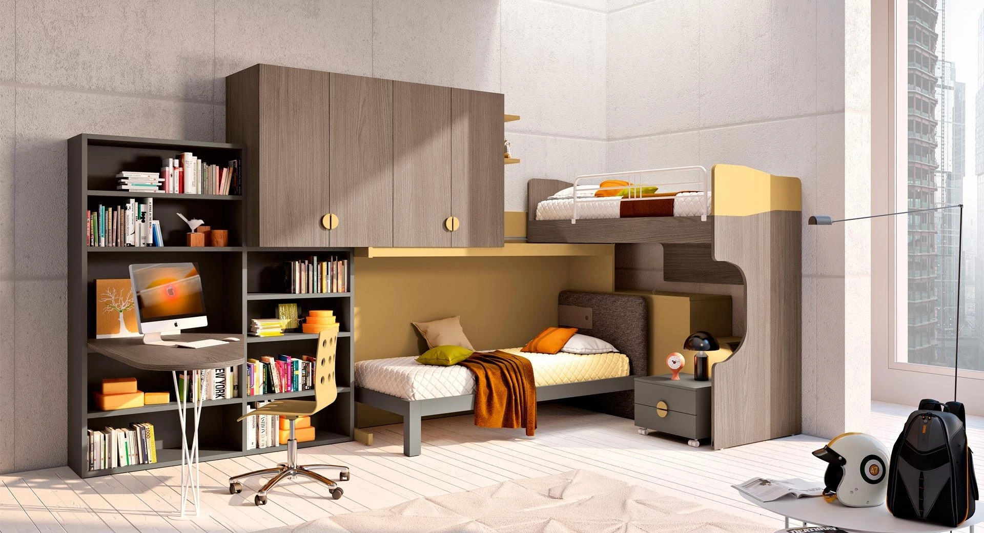 Visitarci significa visionare in prima persona tutte le più esclusive soluzioni per ragazzi a ponte in melaminico che proponiamo in negozio. Per progettare alla perfezione le Camerette, Ferrimobili offre progetti articolati e polifunzionali: sono tante le attività che i tuoi figli svolgono lì. Il conosciuto marchio presenta molteplici soluzioni moderne, così la cameretta è un locale dove i bambini saranno contenti di crescere e riposare. Questa proposta con finitura in melaminico, tra quelle a ponte per ragazzi di Ferrimobili, accontenta le necessità degli adulti e i gusti dei bambini.