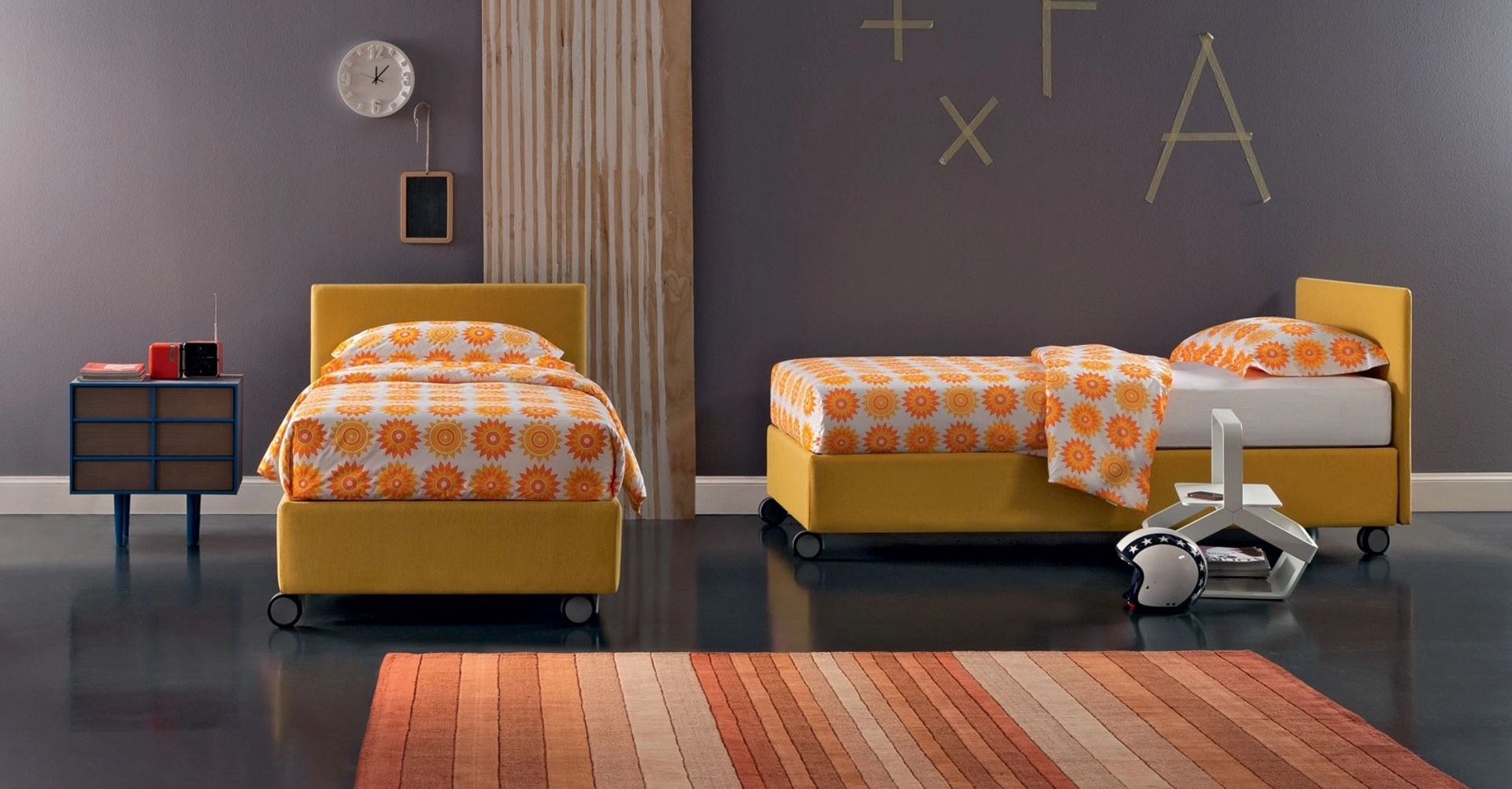 La cameretta dei ragazzini include ogni mobile per assicurare un locale accogliente, in cui sono presenti i letti moderni come questo. Scopri di più sul modello in tessuto nella fotografia: contattaci per qualsiasi info compilando il form qui sotto. Una soluzione che osserva le norme di sicurezza necessarie per progettare l'ambiente dei piccoli. Desideri un letto singolo Oggioni per ultimare la cameretta? Ti presentiamo il Letto singolo Golf 203 di Oggioni che fa parte della nostra collezione di letti imbottiti della marca.