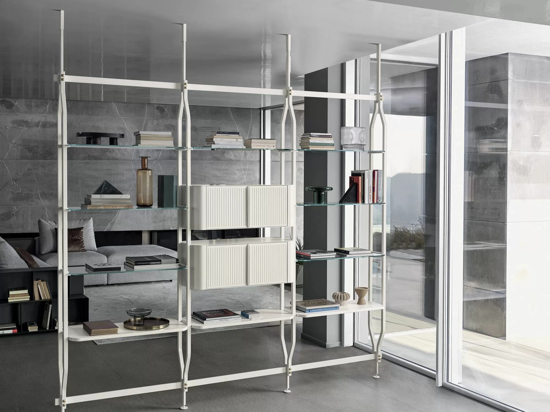 Contattaci per info e preventivi sul modello visibile in foto: se vuoi ultimare stanze design, allora questa libreria dalle forme decise fa per te. Il soggiorno è, per eccellenza, la zona della casa dove ci si riposa ogni giorno, conversando con amici e parenti, riposando in solitudine o guardando la televisione. Le Librerie design sono sempre tanto gradite per progettare la zona giorno e i muri, unendo perfettamente doti di funzionalità e stile. La Libreria Charlotte a soffitto di Bontempi nell'immagine, nella variante in metallo, è davvero funzionale e versatile, robusta e durevole, nonché personalizzabile seguendo le più particolari esigenze abitative. Le Librerie divisorie Bontempi sono disponibili in varie forme: ad angolo, lineari, sospese e realizzabili su misura con molteplici accessori, mensole e vani.