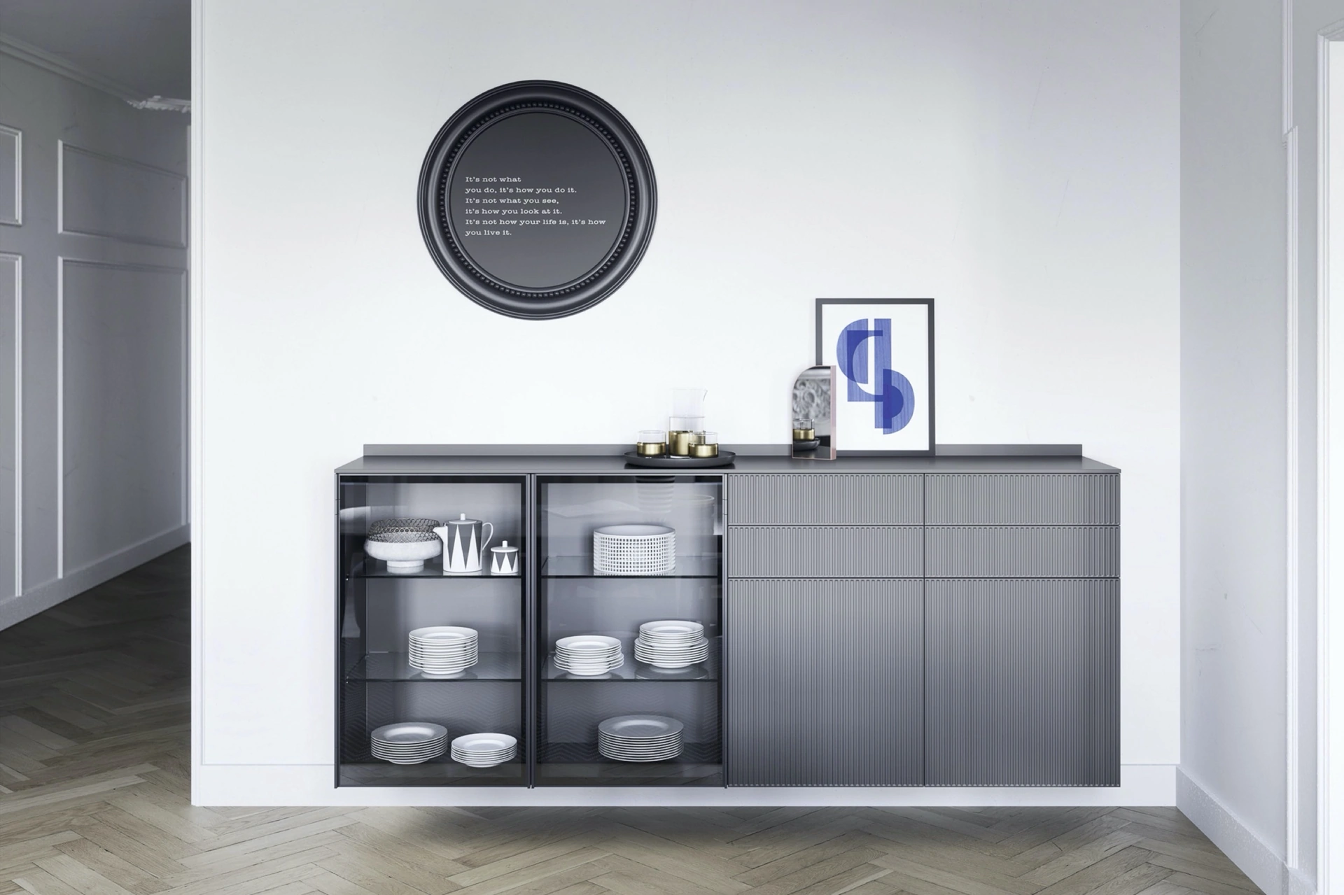Pensile dai richiami moderni realizzato in laccato opaco modello Madia Box 18 03, pensato per sfruttare bene forma e dimensioni delle stanze