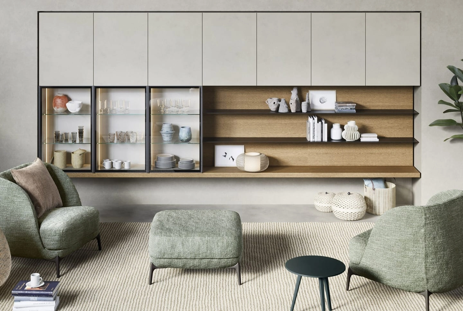 Scopri la nostra serie di mobili soggiorno Novamobili: il modello in laccato opaco Mensole e piani a muro ti attende