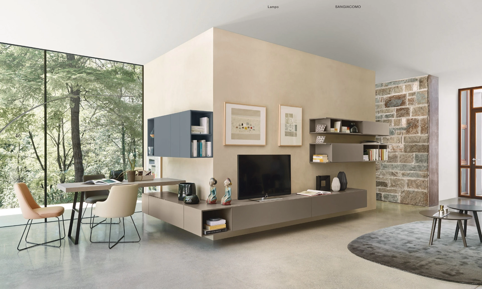 Parete Attrezzata angolare Lampo L6C12 A di Sangiacomo: scopri una delle più originali soluzioni in laccato opaco per arredare il soggiorno con noi
