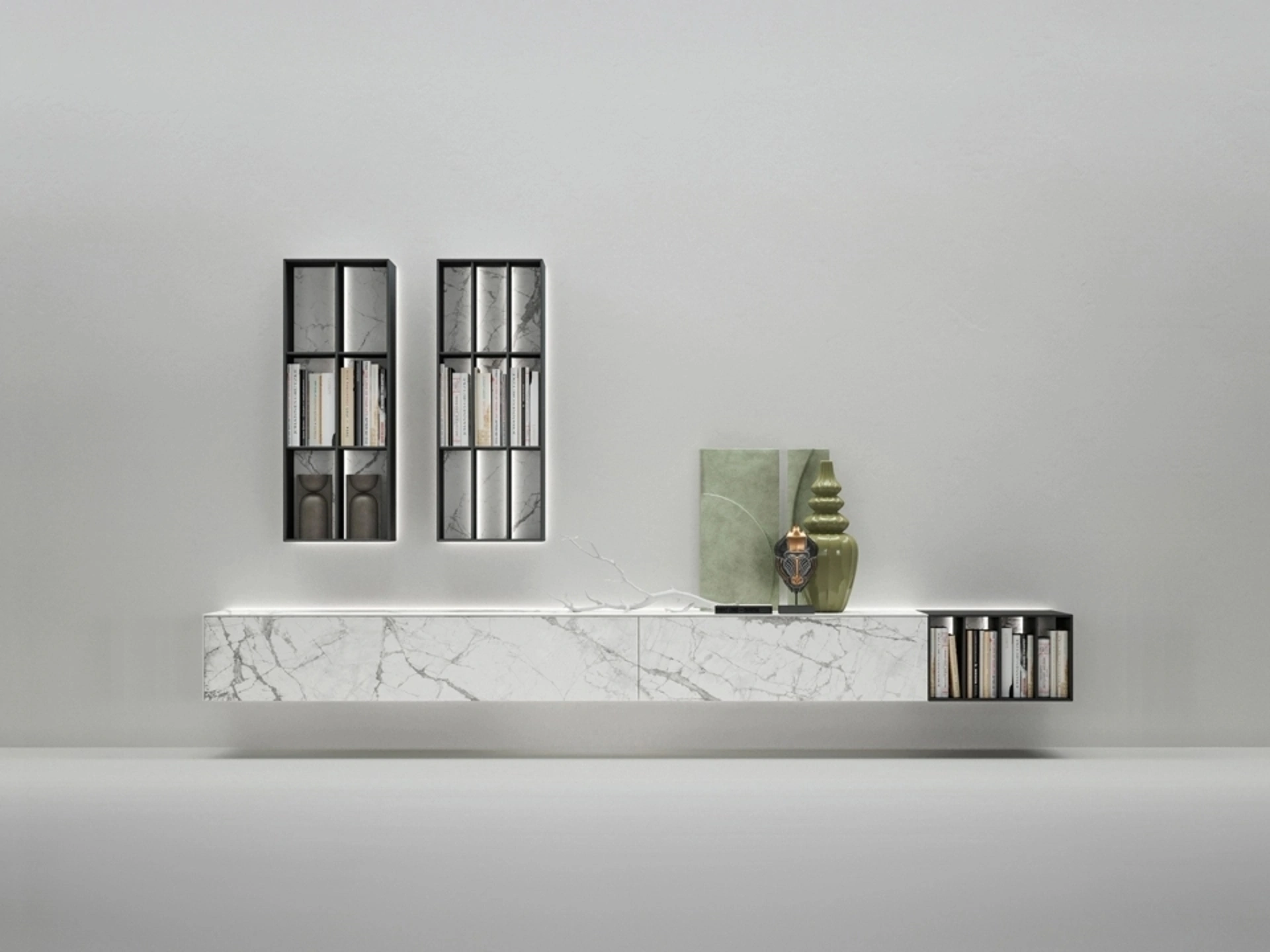 Parete attrezzata Moduli componibili con luci di Caccaro per la zona giorno realizzata in materico