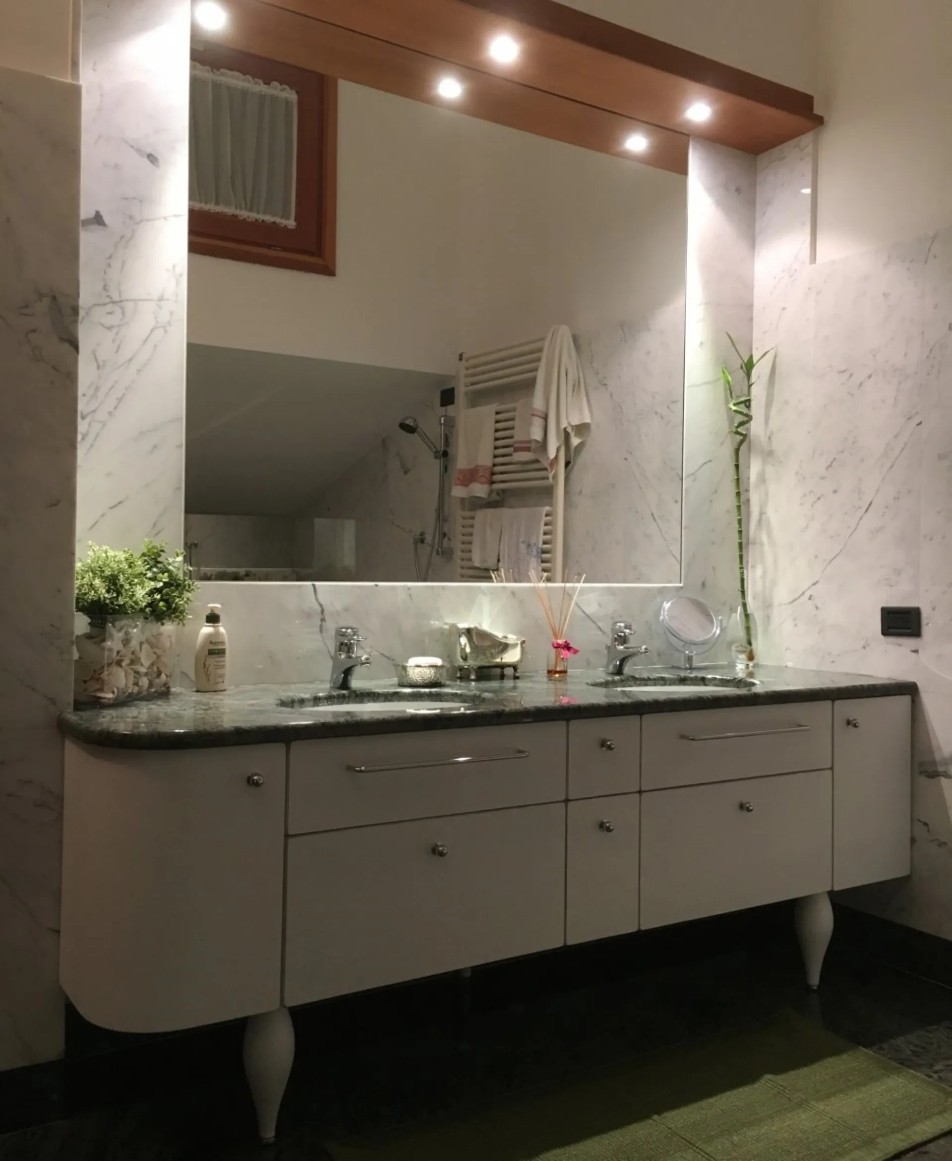 Mobile bagno bianco in legno in stile classico con piano in marmo verde