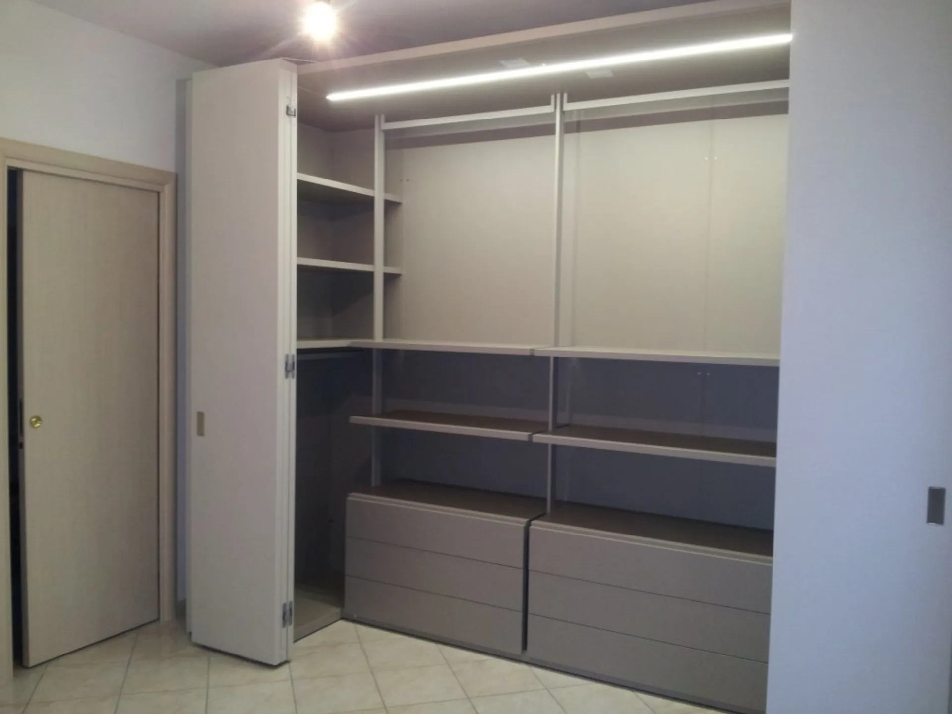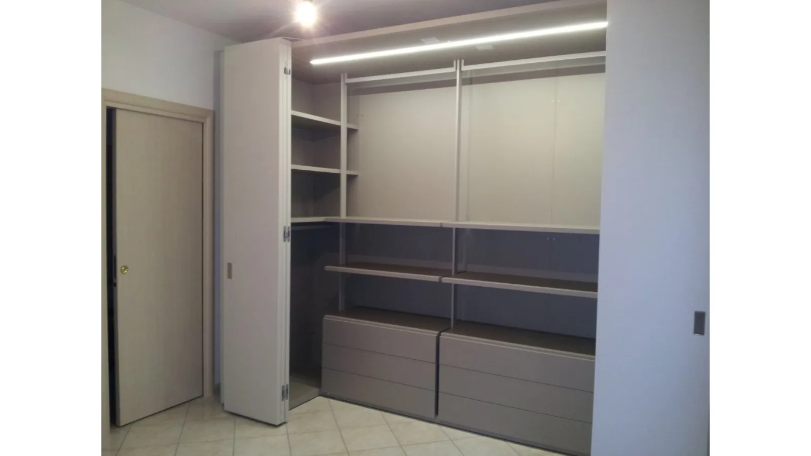 Cabina armadio bicolore con cassettiere e mensole su misura