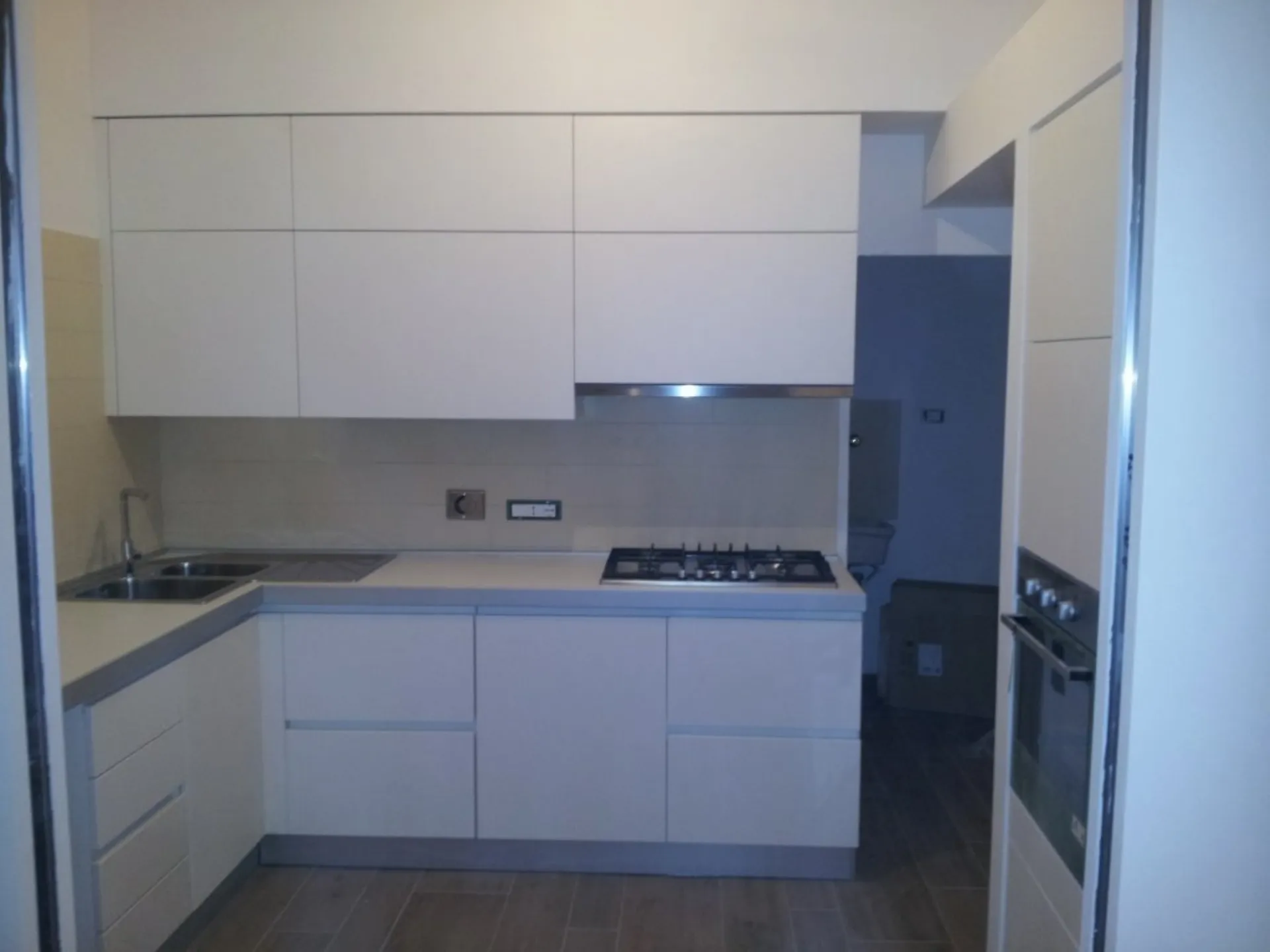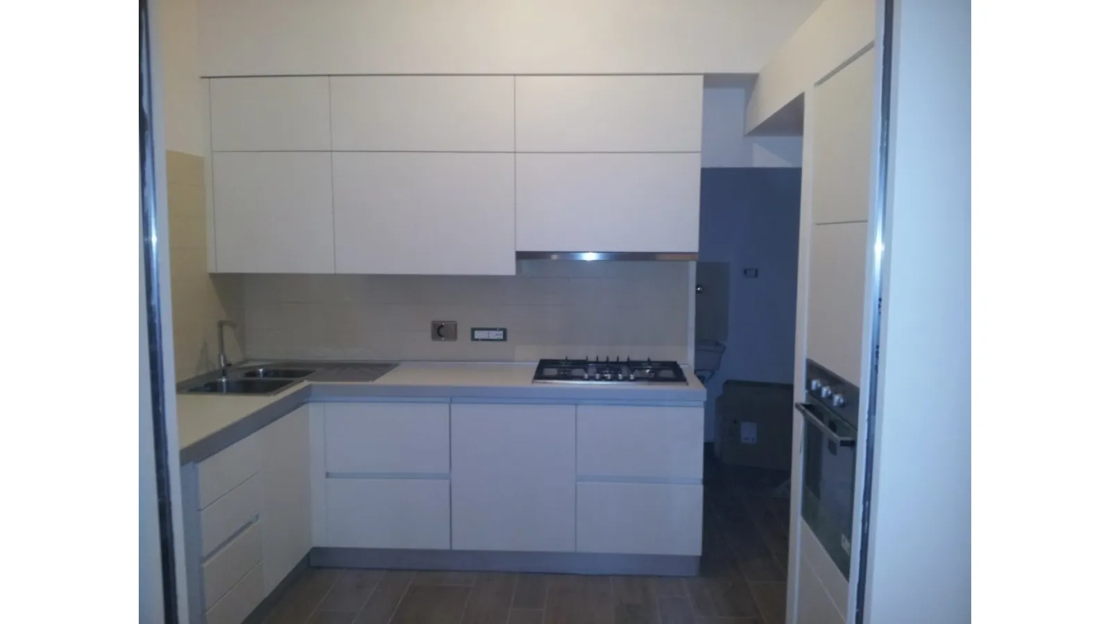 Cucina bianca pratica e funzionale adattata all'ambiente con ante senza maniglie
