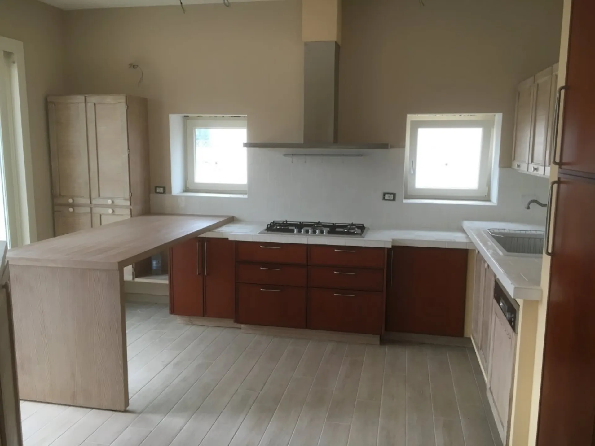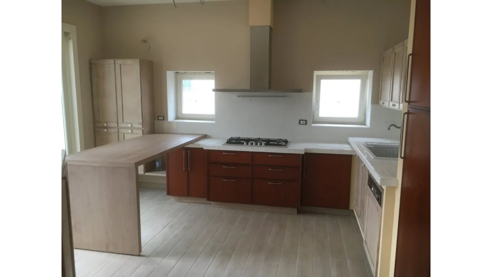 Cucina unica grazie all'abbinamento di vari materiali e alla penisola in legno