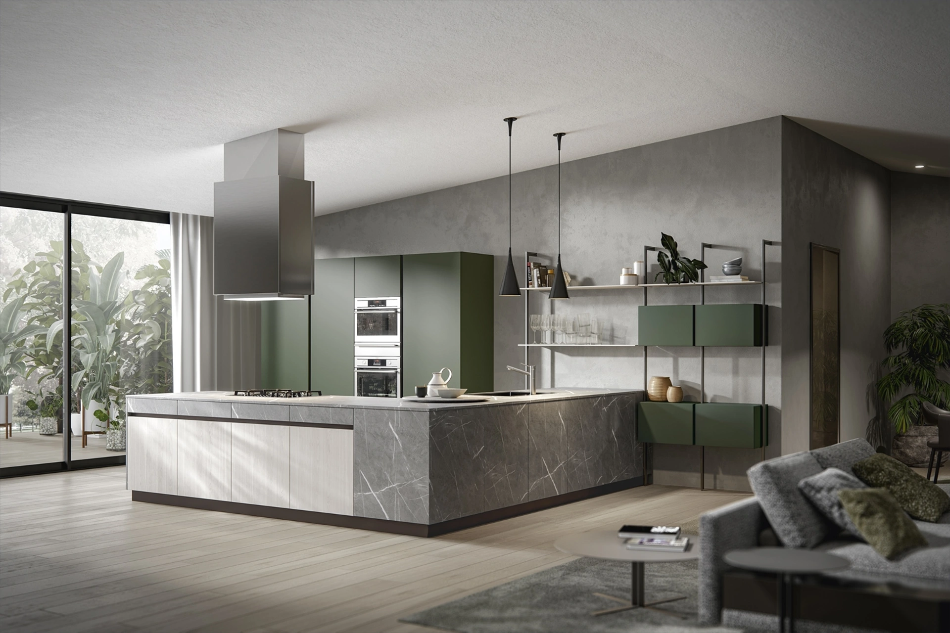 Quando scegli una cucina moderna devi dare priorità al modo in cui vivi i tuoi locali, per progettare al meglio la tua composizione d’arredo. A rendere la Cucina Moderna Logos con penisola di Home Cucine una tra le più belle soluzioni del marchio, oltre ai suoi bellissime decorazioni, è il materiale: è costruita in melaminico per assicurare comfort e sicurezza nel tempo. Se vuoi una soluzione dalle linee geometriche, caratterizzata da un design meno "pesante", ti suggeriamo di orientare la scelta verso le Cucine Moderne del marchio Home Cucine.