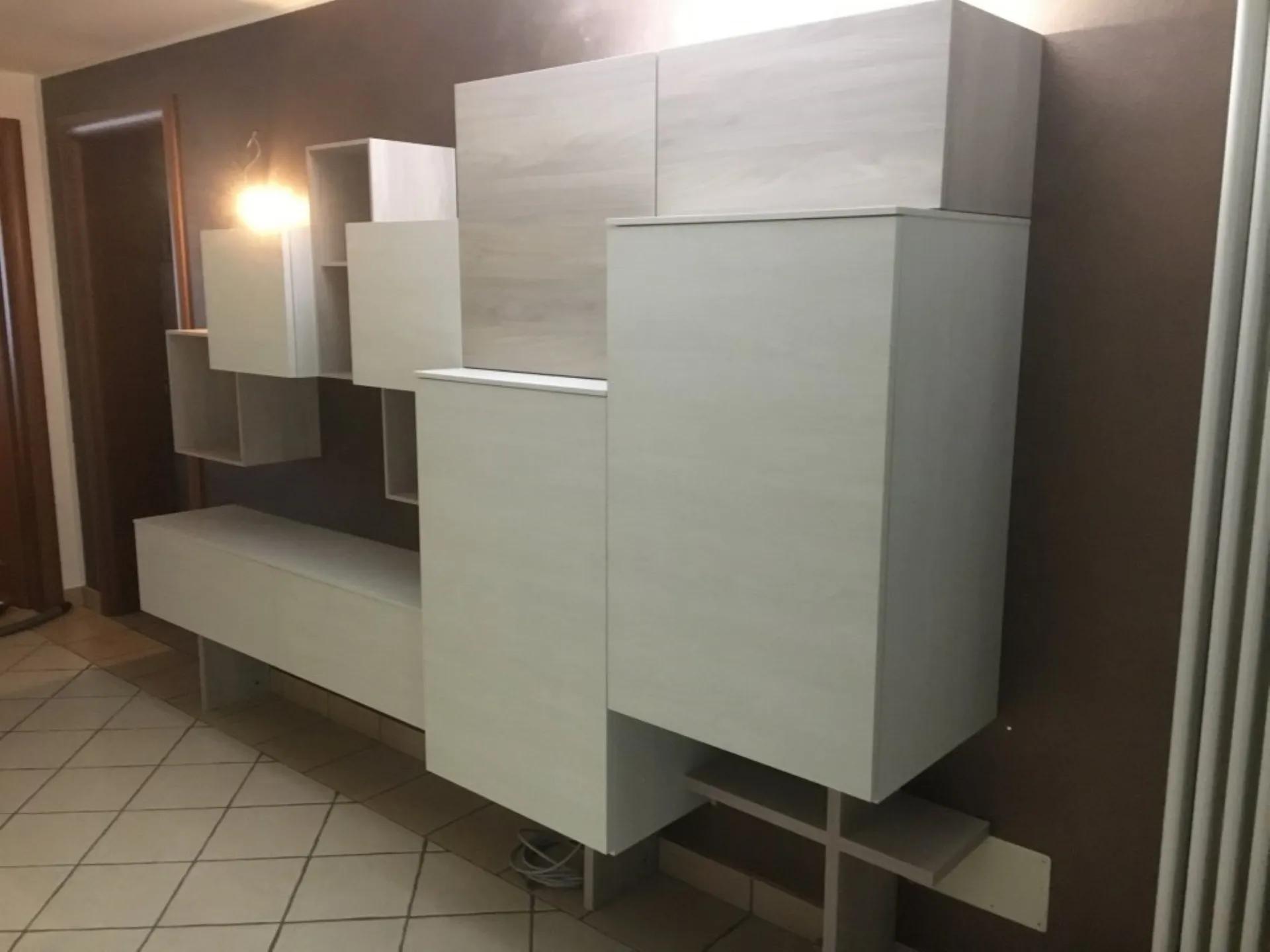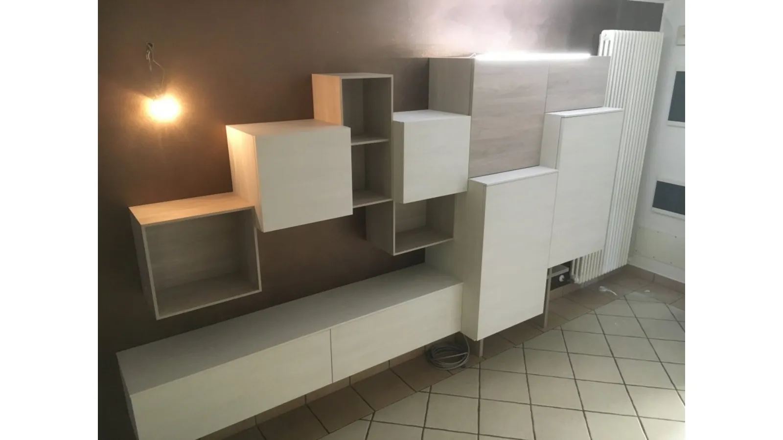 Realizzazione parete soggiorno con moduli intercambiabili di vari colori senza maniglie