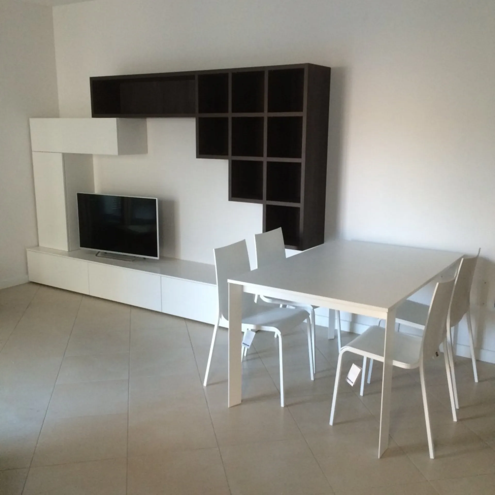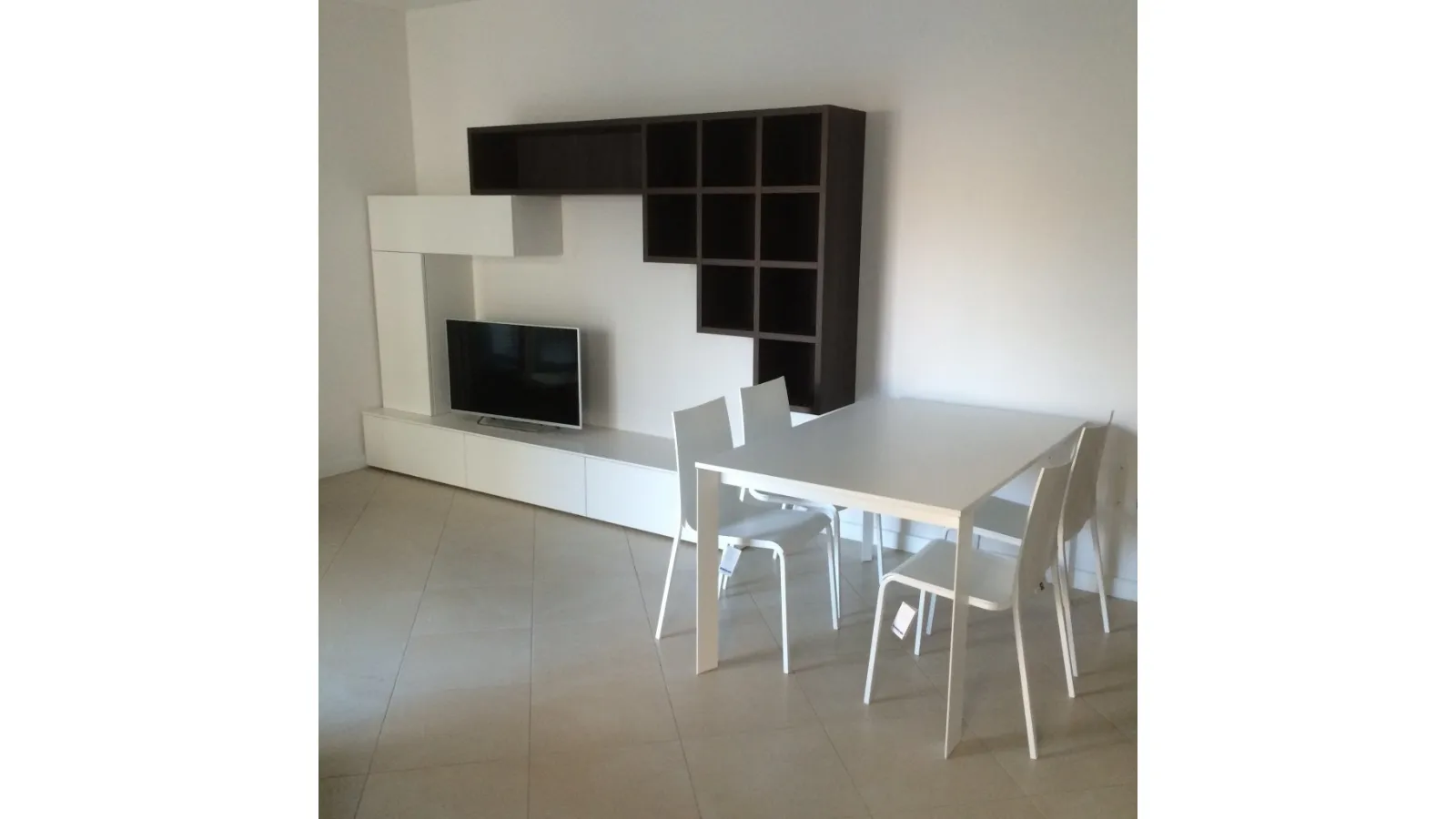 Soggiorno moderno formato da una parete attrezzata con pensili e moduli bianchi e neri